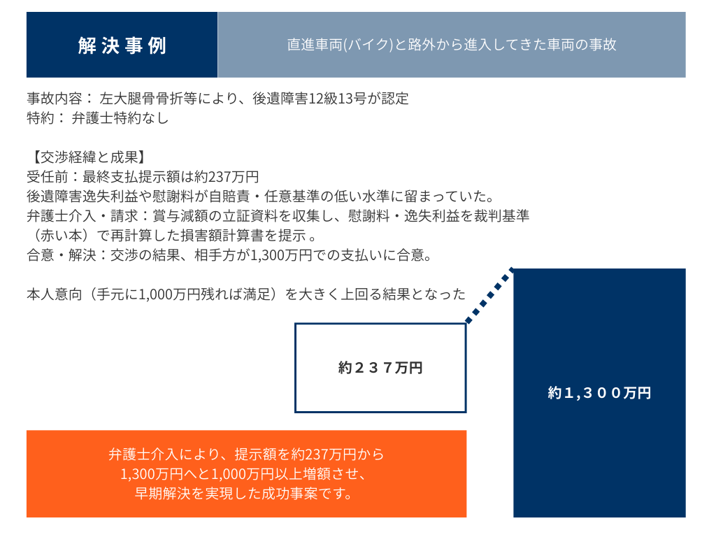 依頼者がバイクで道路を直進中に、道路外から道路へ侵入してきた相手方が運転する四輪車両と側面衝突。