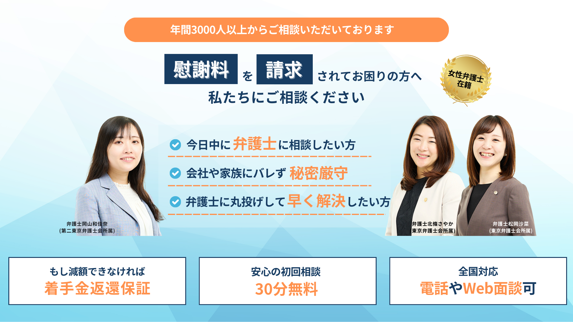 私たちは、慰謝料を請求された方のために専門チームを作り対応しています。ご相談ベースで年間3000件のお問い合わせをいただいています。