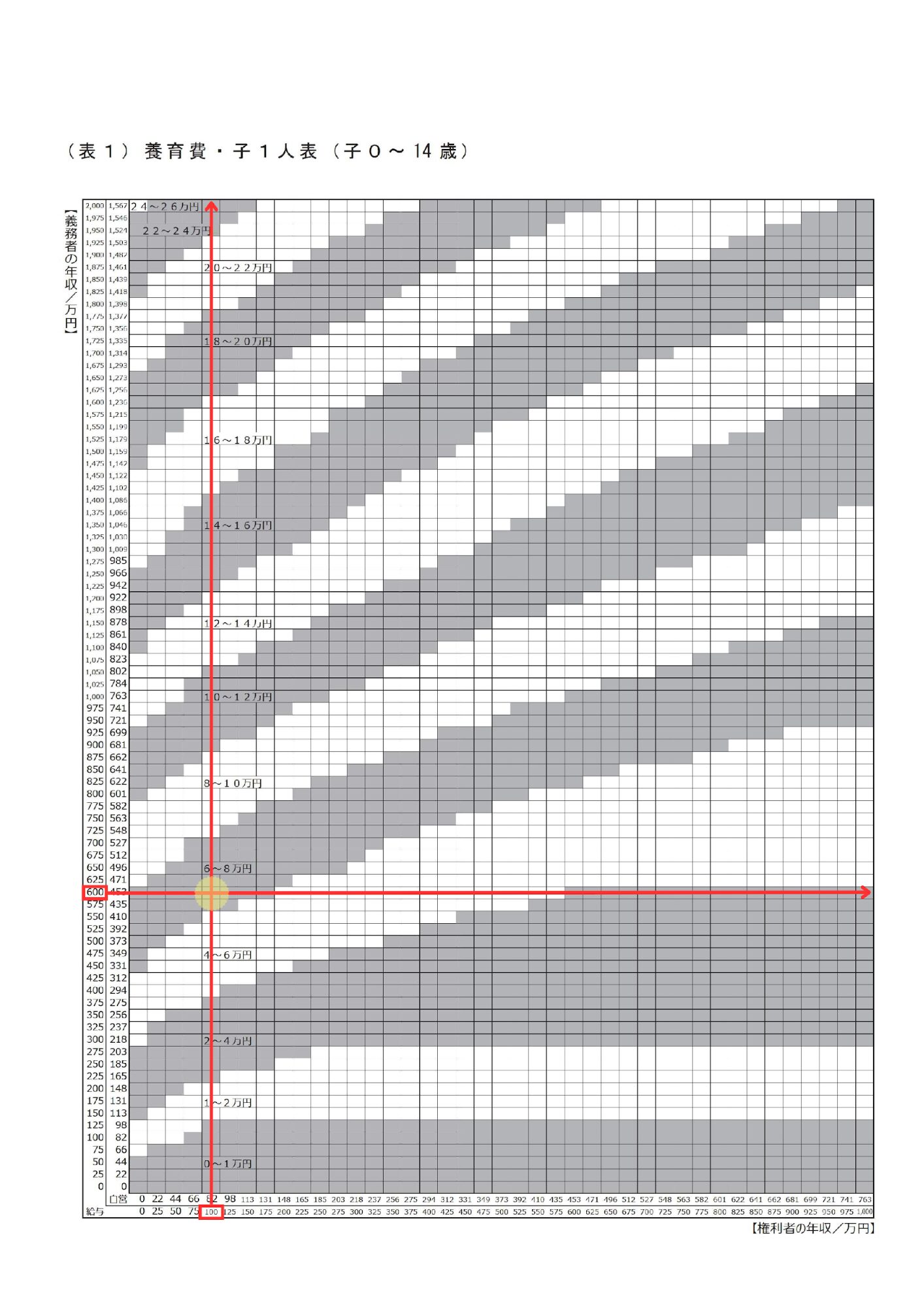 表の縦軸上の義務者の年収の欄を右に伸ばした線と、横軸上の権利者の年収の欄を上に伸ばした線が交わる部分を確認します。