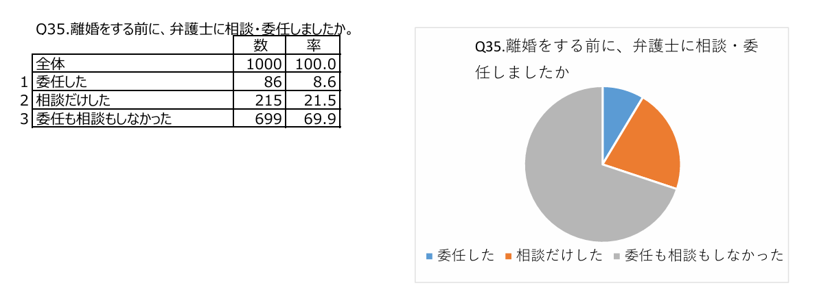 法務省が公表した協議離婚制度に関する実態調査結果の概要では、調査対象となった協議離婚を経験した30代~40代の男女(合計1000名)のうち約7割の方が、弁護士のサポートを一度も受けることなく離婚をしたことが報告されています。