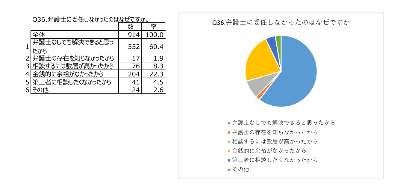 弁護士に依頼(委任)しなかった方のうち約6割の方は、その理由について「弁護士なしでも解決できると思ったから」と回答しています。
