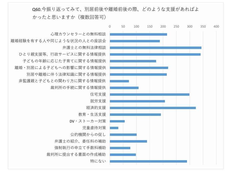 実際に、離婚後に振り返り、弁護士との無料法律相談や、離婚や別居に伴う法律知識、行政サービスなど離婚後の生活に関する情報提供などの支援があれば良かったと思う方も多いです。
