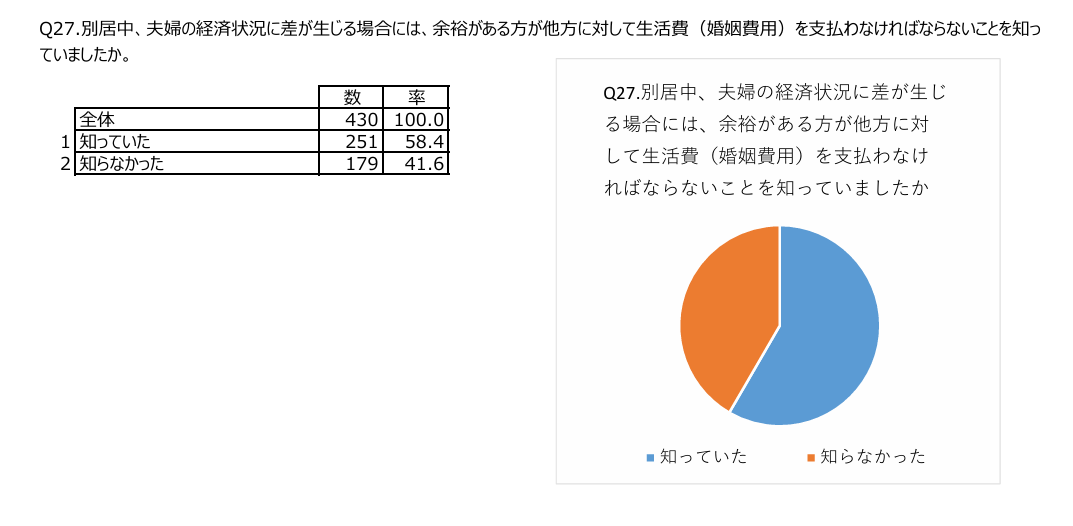 例えば、前掲調査結果の概要によると、離婚前に別居をしたと回答した方のうち約4割の方が、別居中、夫婦の経済状況に差が生じた場合には、収入の多い方が他方に対して生活費(婚姻費用)を支払わなければならないことを、「知らなかった」と回答しています。
