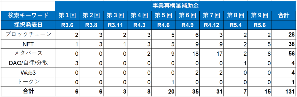 以下は、Web3に関連するキーワード(メタバースも含む。)で補助金が採択された件数です。